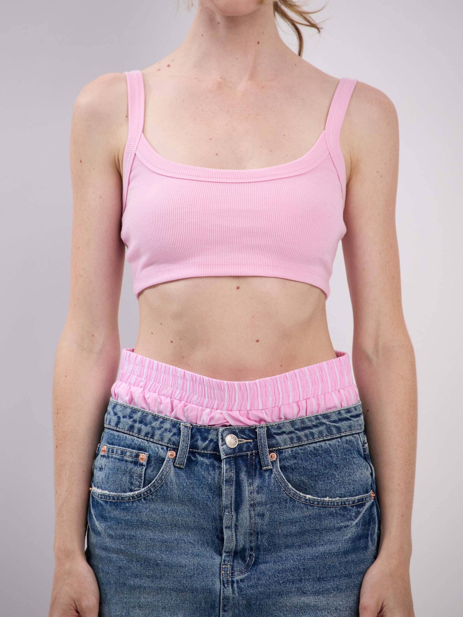 PRESTYLED BOXER WAIST DENIM SKIRT, FRONT AND BACK POCKETS, BUTTON CLOSURE